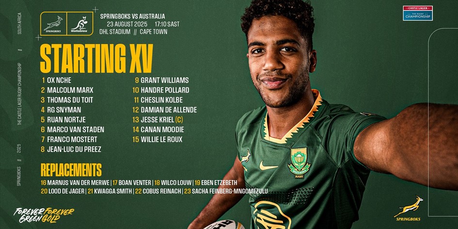 The five players who will start against Australia for the second week in a row are Nche, Malcolm Marx, Marco van Staden, Grant Williams, and Kriel – who takes over the captaincy from the injured Siya Kolisi – while Franco Mostert, Canan Moodie, Wilco Louw, Boan Venter, Eben Etzebeth, Lood de Jager, Kwagga Smith, and Cobus Reinach are the other players who will get another run against the visitors.