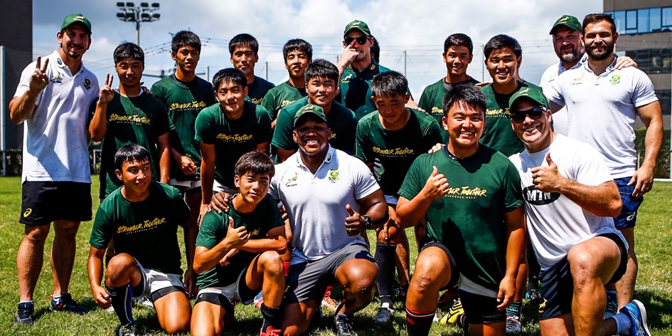 Assistant coach Matt Proudfoot, Schalk Brits, Kwagga Smith, Bongi Mbomambi, Jesse Kriel and Cobus Reinach gave a coaching masterclass to high school pupils while the ‘little and large’ of the touring party – RG Snyman and Herschel Jantjies – visited the prefecture governor’s office to present gifts, including an ostrich egg carved with a Springbok badge and a message to the local government.