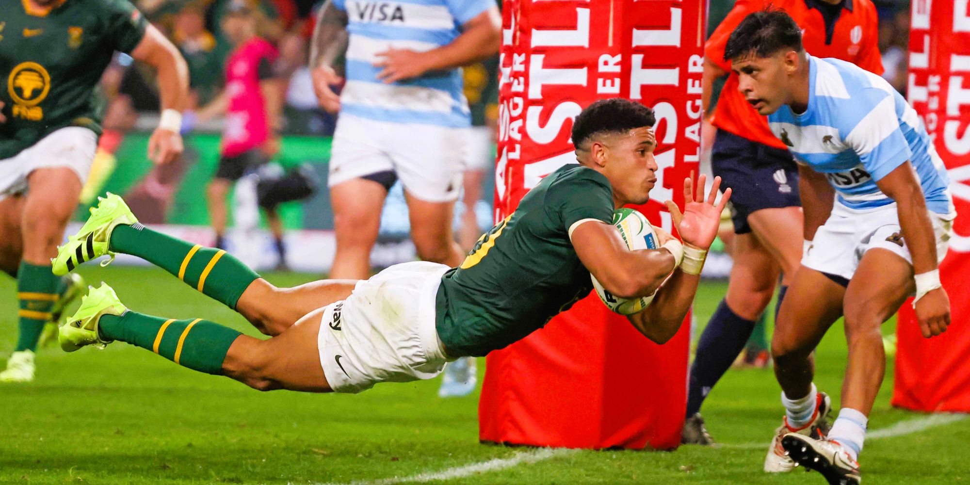 Sacha Feinberg-Mngomezulu scored a record 37 points, including three tries, as the Springboks beat Argentina 67-30 (half-time 25-23) to go top of the Castle Lager Rugby Championship log at Hollywoodbets Kings Park in Durban on Saturday.